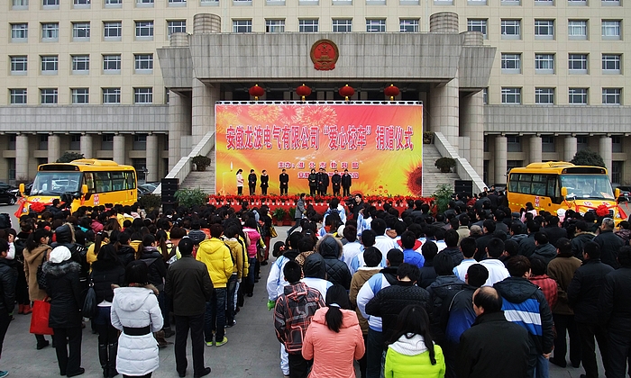 2月8日上(shang)午,安(an)(an)徽龍(long)波(bo)電(dian)氣有(you)(you)限(xian)公(gong)司(si)“愛心校車(che)(che)”捐(juan)(juan)(juan)贈(zeng)(zeng)儀(yi)式在淮北市政府隆重舉辦。副市長王(wang)莉莉主持(chi)捐(juan)(juan)(juan)贈(zeng)(zeng)儀(yi)式,市委(wei)書記(ji)畢美家到(dao)場并講話(hua)。作為捐(juan)(juan)(juan)贈(zeng)(zeng)方,安(an)(an)徽龍(long)波(bo)電(dian)氣有(you)(you)限(xian)公(gong)司(si)董(dong)事(shi)(shi)(shi)長陳文軍(jun)到(dao)場并發(fa)(fa)(fa)表了講話(hua)。 在十多(duo)(duo)年(nian)的(de)(de)發(fa)(fa)(fa)展(zhan)歷程中(zhong),龍(long)波(bo)電(dian)氣始(shi)終堅持(chi)將公(gong)益事(shi)(shi)(shi)業與企業發(fa)(fa)(fa)展(zhan)融于一體(ti),在企業發(fa)(fa)(fa)展(zhan)的(de)(de)同時不忘回報社會(hui),積極履(lv)行(xing)企業的(de)(de)社會(hui)責任。在此次“愛心校車(che)(che)”捐(juan)(juan)(juan)贈(zeng)(zeng)公(gong)益活動之前,已經為中(zhong)國(guo)扶貧基金會(hui)、安(an)(an)徽省青(qing)少年(nian)發(fa)(fa)(fa)展(zhan)基金會(hui)、安(an)(an)徽省希(xi)望工程、淮北市希(xi)望工程、淮北市慈(ci)善(shan)協會(hui)、汶川大(da)地(di)震、青(qing)海玉樹地(di)震等社會(hui)公(gong)益活動多(duo)(duo)次捐(juan)(juan)(juan)款(kuan)捐(juan)(juan)(juan)物。體(ti)現(xian)了龍(long)波(bo)人(ren)的(de)(de)愛心,體(ti)現(xian)了龍(long)波(bo)公(gong)司(si)對社會(hui)公(gong)益事(shi)(shi)(shi)業的(de)(de)滿腔熱情和(he)關注。 此次“愛心校車(che)(che)”捐(juan)(juan)(juan)贈(zeng)(zeng)活動,僅僅是一個開始(shi)。龍(long)波(bo)公(gong)司(si)將繼續支(zhi)持(chi)教育事(shi)(shi)(shi)業,繼續投入社會(hui)公(gong)益事(shi)(shi)(shi)業的(de)(de)建設,以(yi)實際行(xing)動支(zhi)持(chi)社會(hui)公(gong)益事(shi)(shi)(shi)業的(de)(de)發(fa)(fa)(fa)展(zhan)! 安(an)(an)徽龍(long)波(bo)電(dian)氣有(you)(you)限(xian)公(gong)司(si)校車(che)(che)捐(juan)(juan)(juan)贈(zeng)(zeng)現(xian)場 市委(wei)書記(ji)畢美家講話(hua) 安(an)(an)徽龍(long)波(bo)電(dian)氣有(you)(you)限(xian)公(gong)司(si)董(dong)事(shi)(shi)(shi)長陳文軍(jun)講話(hua) 贈(zeng)(zeng)車(che)(che)交接儀(yi)式 新型校車(che)(che)