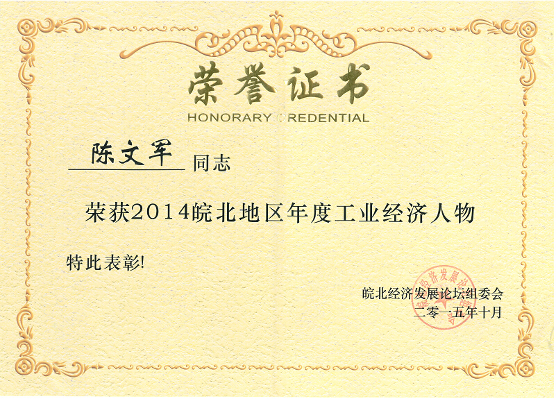 10月15日上午,在皖北經濟發展論壇2015年宿州年會上,“2014皖北地區年度工業經濟人物”揭曉,公司董事長、總經理陳文軍當選“2014皖北地區年度工業經濟人物”。 “2014皖北地區年度工業經濟人物”評選活動,由安徽省皖北辦、安徽省經信委、安徽省國資委、安徽工業經濟聯合會、人民網安徽頻道和皖北六市人民政府共同組織開展。今年的評選活動以評選主題為“推動工業化和信息化深度融合”為主題,旨在展示皖北地區經濟發展成就,表彰為皖北工業經濟發展作出突出貢獻的領軍人物,弘揚創新、創業精神,為社會樹立標桿。