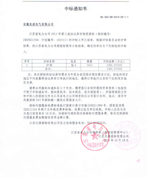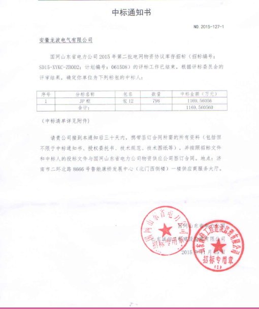 近日,在江蘇省電力公司舉行的2015年第三批協議庫存物資招標中以及在國網山東省電力公司舉行的2015年第二批電網物資協議庫存招標中,安徽龍波電氣有限公司取得重大突破,公司的產品中標2個包,中標金額分別為1303.37萬元、1169.56萬元,中標總金額2472.93萬元。這是龍波電氣繼2015年8月在國網江蘇省電力公司中標以來又一大喜訊。能在國網江蘇省公司及山東省公司中標,證明龍波電氣無論是產品質量還是系統服務都得到了充分認可,為今后進一步做好國網與省級電網市場奠定了良好的基礎。