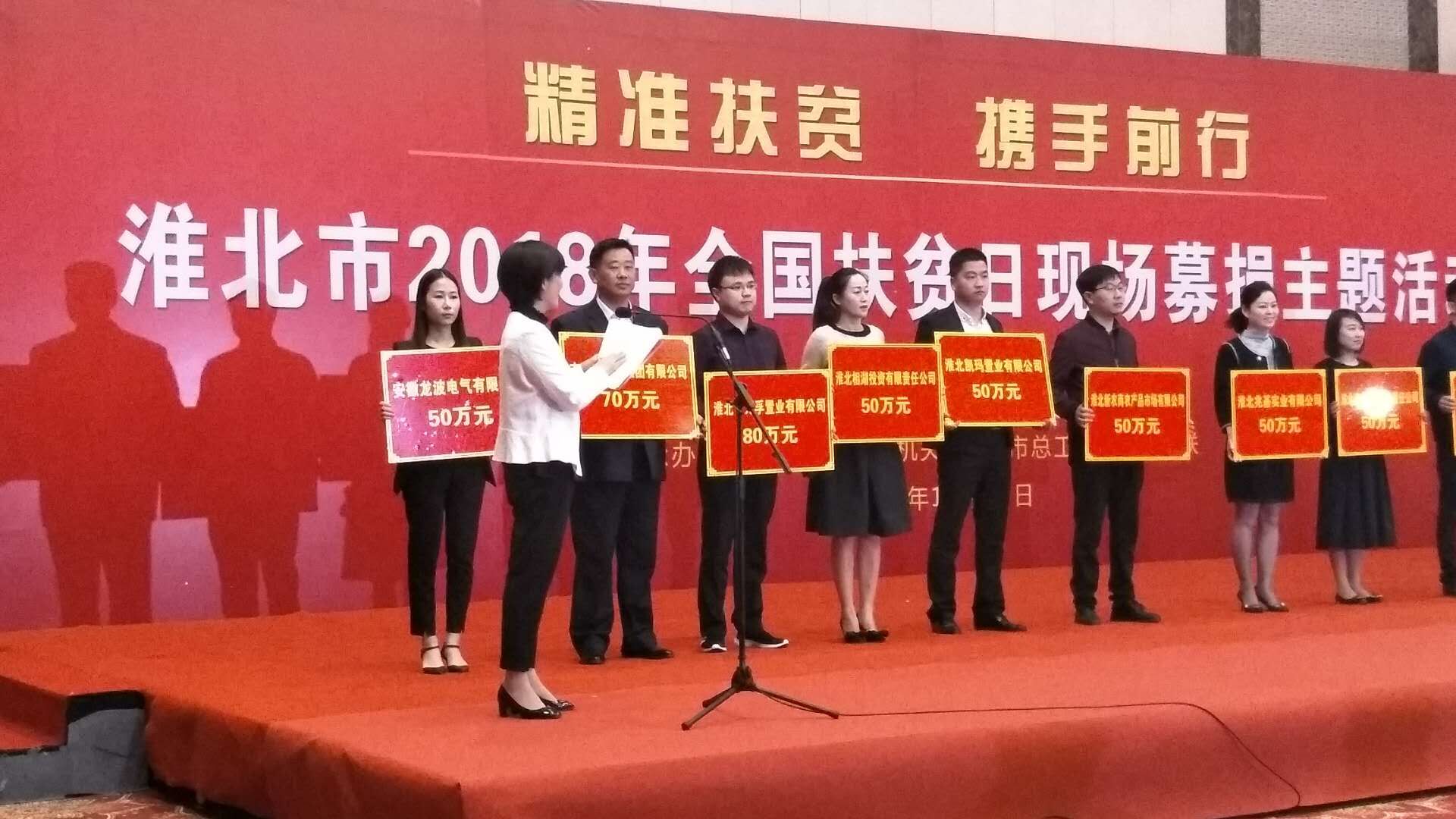10月17日上午,市委、市政府舉行“淮北市2018年全國扶貧日現場募捐主題活動”儀式。此次扶貧募捐活動,目的是號召全市人民和社會各界人士,充分發揚一方有難八方支援的友好精神,弘揚“扶貧濟困、樂善好施”的傳統美德,舉全市之力,匯聚各方支援,支持脫貧攻堅,縮小貧富差距,推進淮北市協調發展,共建幸福美好家園。 多年來,龍波電氣始終堅持將企業發展與社會公益事業融為一體,積極履行企業的社會責任,以實際行動回報社會。公司已先后為中國扶貧基金會、安徽省青少年發展基金會、安徽省希望工程、淮北市希望工程、淮北市慈善協會、汶川大地震、青海玉樹地震、愛心校車捐贈等社會公益活動捐款捐物。此次募捐活動,龍波電氣再次秉承為社會公益獻愛心的企業理念,積極捐款,樂善好施,為扶貧事業盡愛心,為構建和諧社會,實現共建共享的目標貢獻自己的力量。