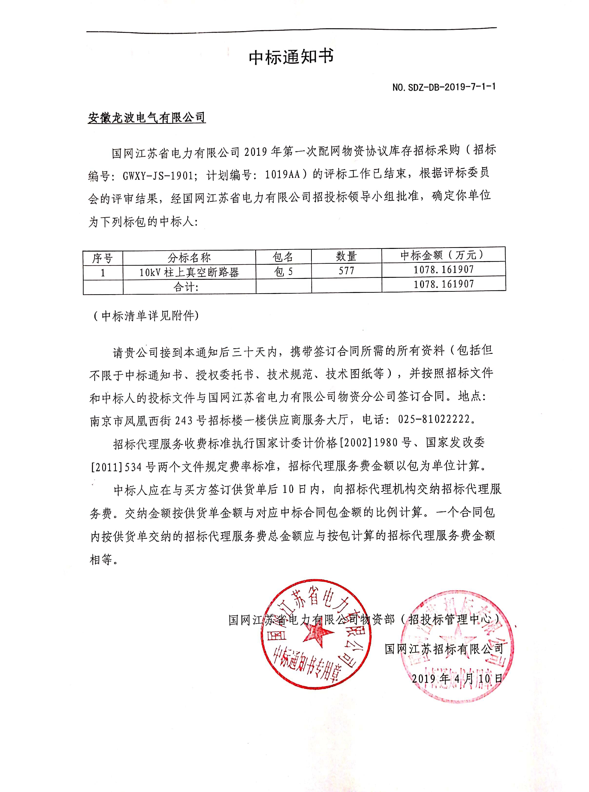2019年4月10日,在國網江蘇省電力有限公司舉行的2019年第一次配網物資協議庫存招標采購中,龍波電氣成功中標10kV柱上真空斷路器,中標金額為1078.16萬元。 此次中標,再次證實了公司的實力和客戶口碑,我們將會付出更過的努力,乘勝前進,爭取創造更好的成績。
