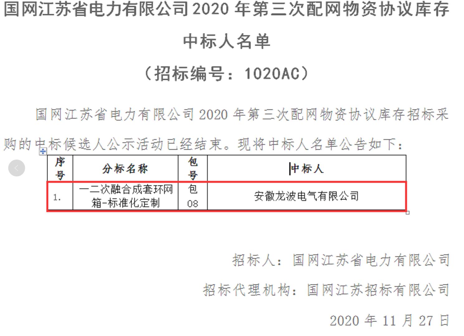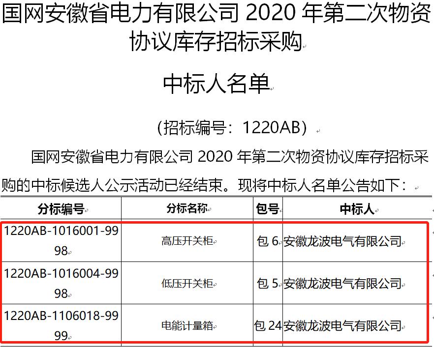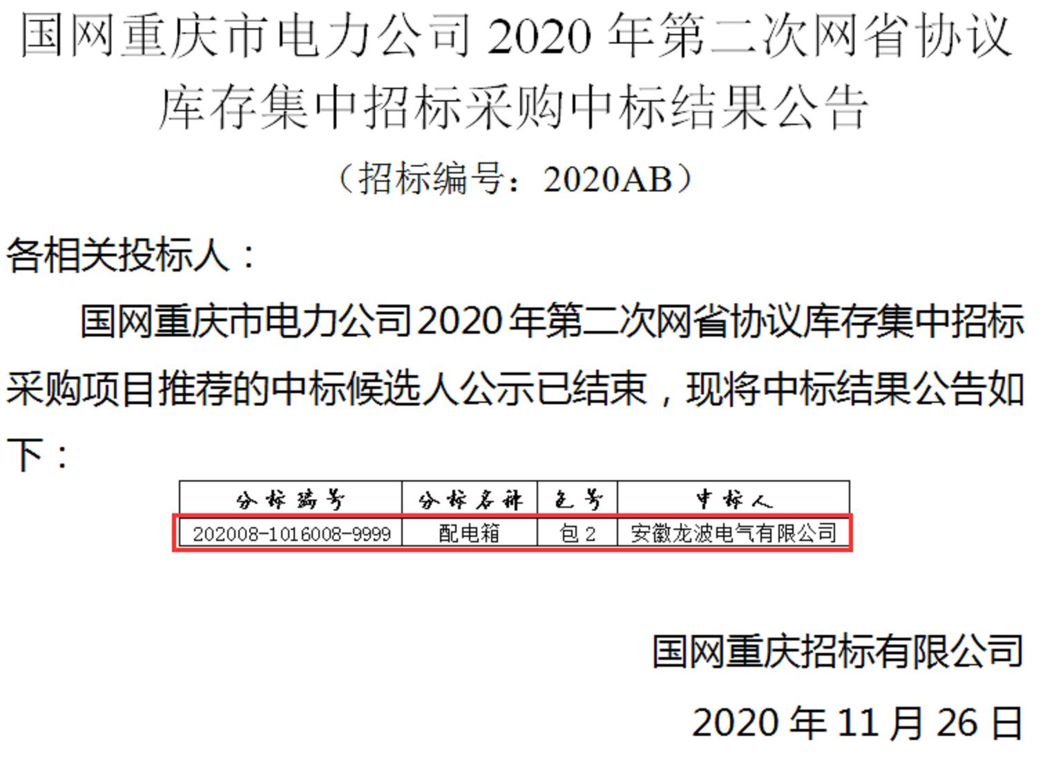 今日捷報頻傳,龍波電氣憑借著優質的產品、雄厚的技術力量以及良好的業界口碑,成功中標國網重慶市電力公司2020年第二次網省協議庫存集中招標采購項目配電箱分標包2(中標金額615.821845萬元);國網江蘇省電力有限公司2020年第三次配網物資協議庫存招標采購項目一二次融合成套環網箱-標準化定制分標包8(中標金額760.5818萬元);國網安徽省電力有限公司2020年第二次物資協議庫存招標采購項目高壓開關柜分標包6(中標金額1539.165092萬元)、低壓開關柜分標包5(中標金額904.018697萬元)、電能計量箱分標包24(中標金額732.232715萬元),共計中標金額4551.82萬元。 本月多個國網省電力公司的投標項目公司領導十分重視,對投標文件、技術質量等都明確了具體要求。因時間緊、工作量大,在領導的帶領下,招投標部門的同事團結協作、共同努力,高效率、高質量完成了編制投標文件的任務,并按期遞交招標方。 本次中標印證了公司良好的發展趨勢,我們一定會再接再厲,為客戶提供更可靠更優質的產品及服務!