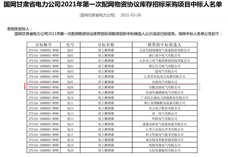 2021年3月26日,在剛剛結束的國網甘肅省電力公司2021年第一次配網物資協議庫存招標采購項目中,我公司確定為柱上斷路器包08貨物中標人,中標總金額為639.174333萬元。該項目是我司在甘肅省電力公司中標的第一個項目,在眾多競爭者龍波電氣能夠脫穎而出,是對公司綜合實力、技術水平、產品質量、核心競爭力的一次肯定,也是國家電網對“龍波”品牌的認可,更是對公司產品的支持與肯定。