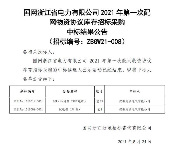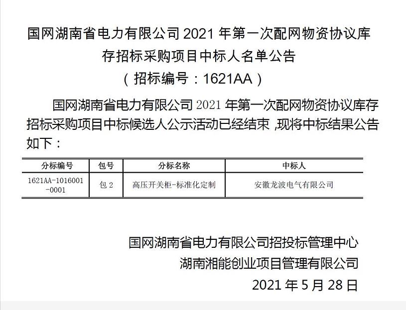 近日,公司捷報頻傳, 5月17日參與投標的國網湖南省電力有限公司2021年第一次配網物資協議庫存招標采購和國網浙江省電力有限公司2021年第一次配網物資協議庫存招標采購兩個項目同時中標。其中,國網湖南省電力有限公司2021年第一次配網物資協議庫存招標采購項目中標1621AA-1016001-0001標段:包2,高壓開關柜-標準化定制,中標金額222.076916萬元;國網浙江省電力有限公司2021年第一次配網物資協議庫存招標采購項目中標1121AA-1016012-0001標段:包29,10kV環網箱(SF6絕緣),中標金額538.901975萬元和1121AA-1016008-0001標段:包1,配電箱(JP柜),中標金額1603.967466萬元。此次成功中標離不開公司領導的正確決策和各部門人員的全力配合。在此,我們對為項目中標付出辛勤努力的同志們表示衷心的感謝!這些成績的取得也印證了公司良好的發展趨勢,我們一定會再接再厲,在企業內功上不斷提升,努力創新,為客戶提供最可靠最優質的產品及服務。