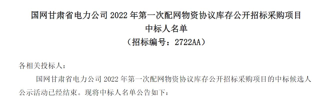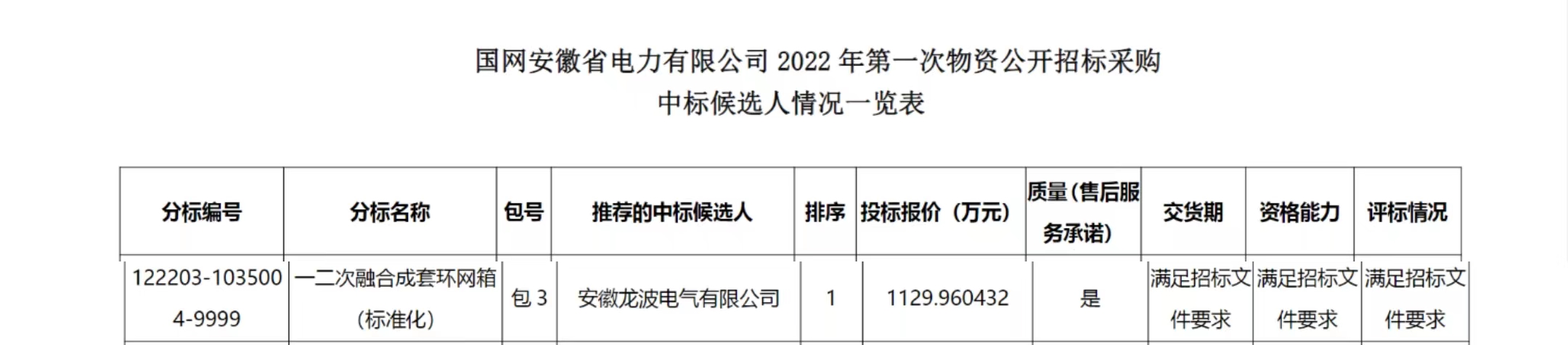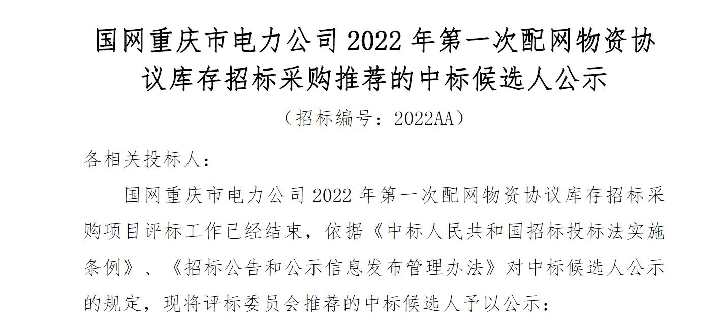 本月,我司在投標項目中,憑借過硬的產品質量,扎實高效的工作作風,卓越的運作團隊和良好的企業信譽,以絕對優勢成功中標國網甘肅省電力公司2022年第一次配網物資協議庫存公開招標采購電能計量箱 包2,中標金額6855721.3元、國網安徽省電力有限公司2022年第一次物資公開招標采購一二次融合成套環網箱(標準化) 包3,中標金額11299604.32元及國網重慶市電力公司2022年第一次配網物資協議庫存公開招標采購低壓開關柜-標準化 包1,中標金額20826964.66元。成績是前進途中的里程碑,今日的成功是昨日的汗水灌溉所結出的碩果。而今后我們需要加倍的努力,以適應瞬息萬變的市場,以實現遠大的目標;腳下的道路,任重而道遠。相信未來會更好!