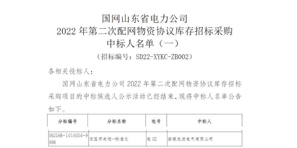 11月2日,國網山東省電力有限公司2022年第二次配網物資協議庫存招標采購的中標公示已經結束,我司成功中標低壓開關柜-標準化包02,中標金額893.410301萬元。公司在眾多的競爭者當中脫穎而出,順利再次中標,這無疑是對公司的綜合實力、技術水平的又一次肯定,也是客戶對安徽龍波品牌的認可,更是對安徽龍波產品的認可。此次成功中標離不開公司領導的正確決策和各部門人員的全力配合。項目中標對公司以后業務推廣、拓寬市場具有重要意義,不僅展示了公司的實力,同時也展示了我公司的核心競爭力。