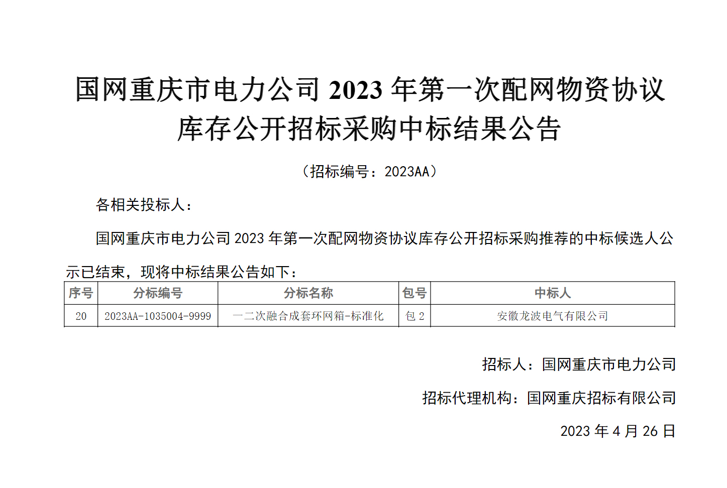 4月26日,國網重慶市電力有限公司2023年第一次配網物資協議庫存公開招標采購的中標活動已經結束,我司成功中標一二次融合成套環網箱-標準化,中標金額1145.919922萬元。此次中標,再次展現了龍波電氣良好的發展勢頭,在眾多競爭者中脫穎而出是對公司綜合實力、技術水平、產品質量的肯定,也是對公司品牌的認可,相信公司可以在電氣行業走得更遠更穩!