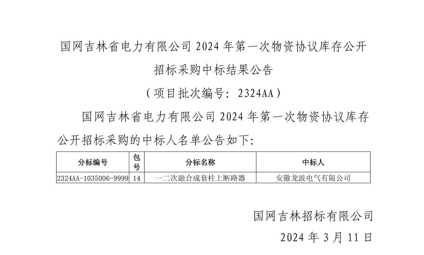 中標(biao)喜訊!成功中標(biao)國網(wang)吉(ji)林省(sheng)電力有(you)限公司(si)2024年第(di)一次配網(wang)物資(zi)協議(yi)庫(ku)存招標(biao)采購(gou)項(xiang)目