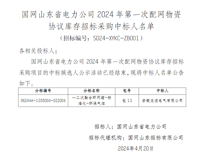 2024年4月20日,國網山東(dong)省電(dian)力公(gong)司2024年第(di)一次配網物資(zi)協議(yi)庫存招(zhao)標采購(gou)項(xiang)目(mu)的中標公(gong)示(shi)活動已經結(jie)束(shu),我(wo)司成(cheng)功中標一二次融(rong)合環網箱-標準化-環保(bao)氣體,中標金額(e)1178.419198萬(wan)元。