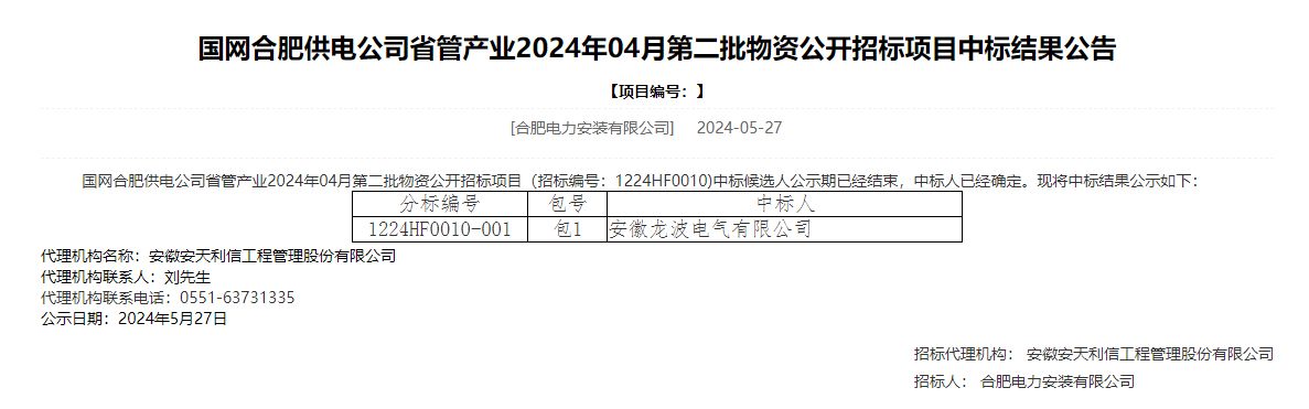 中標喜訊!成功中標國網合肥(fei)供電公司省管產業(ye)2024年4月第二批物資公開(kai)招標項(xiang)目